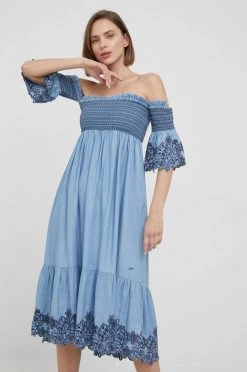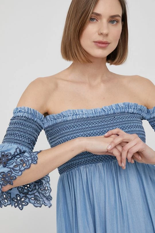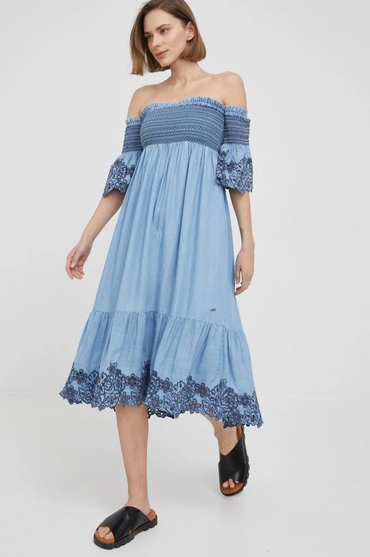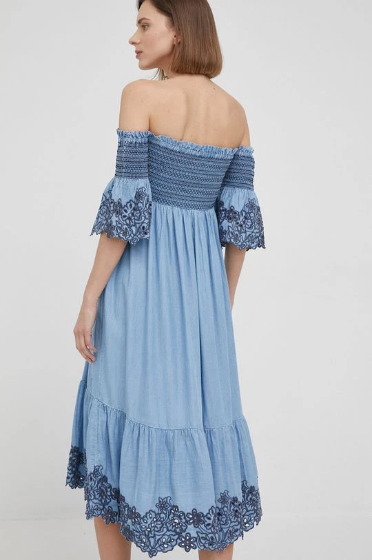 Φόρεμα από τη συλλογή Pepe Jeans. Ανοιχτό μοντέλο από από ύφασμα με απλικέ.