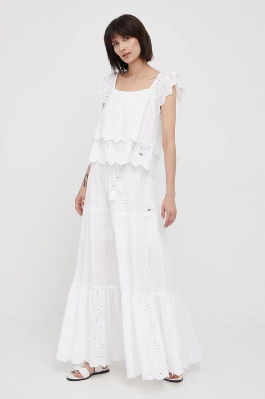 Φούστα από τη συλλογή Pepe Jeans. Μοντέλο με που απλώνεται προς τα έξω κόψιμο, από ύφασμα με απλικέ.